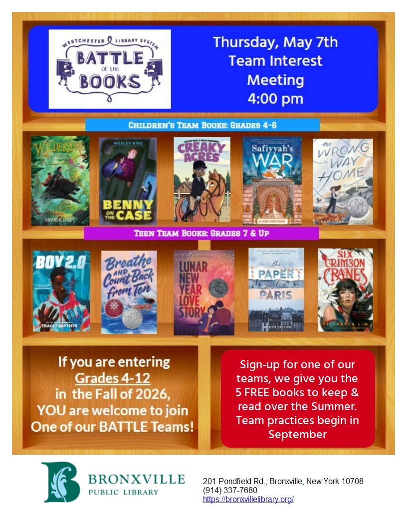 The Bronxville Library plans to host two teams this year for students entering grades 4–12 in Fall 2026: a Children’s team (Grades 4–6) and a Tween/Teen team (Grades 7+). Each team member will receive five free books to keep.